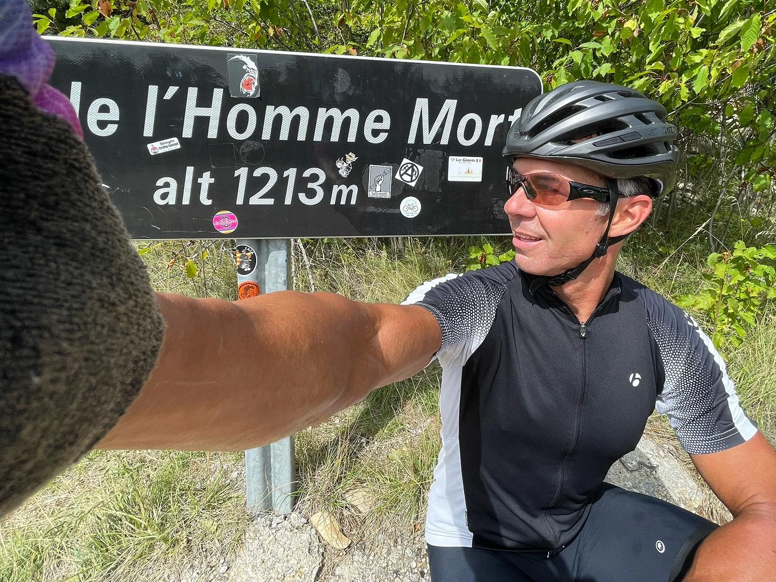 The idea is you get it stamped at all three route locations at the bottom of the mountain and again at the summit to prove you did it. In addition, he took photos along the way, so there should be no misunderstanding about his achievement. And it is a massive achievement. I hardly like going up one side in one day, let alone all three. Just so Jason didn’t feel too alone in the endeavour, Leah and I rode up from Bedoin late in the day so we could meet up on the mountain and then celebrate with pizza and beers at the end. We located Jay almost at Chalet Reynard coming up the last time from Sault. When he arrived at Pizza Phil’s, he was so glad he finally did it “officially” and is now a Cinglé: 4400 metres of elevation over approximately 140 km. It is indeed crazy!
